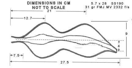 The 5.7 mmSS190 ball penetrates between 10 and 11 inches of gelatin, but the wound resulting from this projectile is a relatively small. The permanent cavity at its largest is either a .22 cal hole or simply a . 22 caliber flat slit the length of the projectile (2.1 cm) caused by the projectile tumbling.