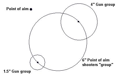 stated as being 3.5 kg (7.7 pounds ). Rifles that do not meet all of these specifications are technically not "scout rifles." Thus rifles of this general design in calibers other than those stated above are not true scout rifles but actually "pseudo-scouts." Note, however, even though Steyr Mannlicher (and now Savage) are making production rifles of this type (as well as some wild variations) they are under no legal obligation not to call their variations "scouts" as a marketing tool. Thus the Steyr .376 Scout also known as (and probably better referred to as the ".376 Dragoon" although Jeff dislikes the term) nor the .223 variation are true scout rifles. For that matter neither are the custom made scout-like rifles made up in .30-06, .375 H&H, or what ever caliber. However, there are many parts of the scout design concept that can be handily used on non-scout or "scout type" rifles. Q. Won't having a more accurate firearm make me a better shot? A. Not really. It is the shooters ability that really makes the difference and not the ability of the firearm. (Despite what the advertising folks would have you believe.) The intrinsic accuracy of most firearms is much better that that of the vast majority of shooters--probably better than 98 percent of them. I have seen many, many, times an excellent shot hit everything he could see with a pedestrian 3 to 4 minute rifle while duffers with incredible tack drivers missed the proverbial barn less than 100 yards away. Look at the drawing below. The large circle represents the "group" size (let's say 6" for this example.) that a particular shooter might be able to hold his point of aim to in the field--not off the bench. (That is, his actual point of impact would be somewhere in that circle with the proverbial "one hole" rifle.) With a rifle capable of shooting into 4 MOA off the bench the actual point of bullet impact in the field will be within a 2" radius of the shooter's actual point of aim somewhere within that 6" circle, giving an possible 10" group. (6" + 2" in either direction = 6+2+2=10.) With a 1.5" MOA (just a little more than 1/3 of the 4" group size capable rifle), the resulting actual shooting group would be 7.5" which is not all that much better, and surely not enough to magically guarantee hits in the field for the average shooter. We can't count on the random chance that the error will be towards the center of the target. Until the shooter is capable of holding much closer than the intrinsic accuracy of the firearm, the firearm's accuracy doesn't count for much. While "accurate rifles" are interesting (with apologies to Townsand Wheelen) money and effort spent on learning to shoot well will be much more rewarding than that spent than on trying to build a tack driver.