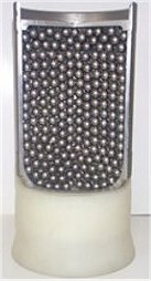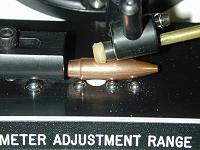 The I.C.C. cost over $1200 and is out of production.. However, a lot were sold to serious shooters so you might be able to locate a used one. Powder Type & Charge - One of the big factors affecting accuracy comes about from the barrel's vibration for a particular bullet weight. These vibration harmonics are caused by the bullet's acceleration and spin and are nearly constant for a given bullet weight. (However, different bullets of the same weight will give different velocities with the same powder charge due to differences in jacket hardness, length of bearing surface, gas seal due to base shape, and core hardness.) Selecting a powder type and charge weight that will put the bullet's velocity into the barrel's "sweet spot" (there are actually several "sweet spots") velocity range will keep the bullet's flight consistent. Powders should be selected on their ability to nearly fill the case (which helps to ensure uniform ignition and burning) and their ability to safely reach the barrel's highest velocity sweet spot. It should be noted here that primers have an effect on pressure and velocity because of their effect on uniformity of ignition. Randomly changing primers can move your velocity out of the "sweet spot" so loads need to be developed using standardized components. (For a discussion of this sweet spot and how to find it using you chronograph see the "Load development" link on my home page.) Case Capacity - Using mixed cases rather than cases sorted by unprimed weight will lead to erratic grouping performance. Sort your cases into batches of equal weight or groups not varying more than about 1/10 gr for smaller cases (.223 size) or 2/10 grain for .308/.30-06 cases Neck Tension - Investigation has recently shown that neck tension (the case's grip on the bullet) can also have a big effect on accuracy. While the permissible variation is still being investigated it has been shown that widely varying neck tension has a drastic affect on group size. This is due to the effect of the force need to get the bullet moving and its effect on the burning characteristics of a powder--similar to the effect of varying the amount of bullet travel before the bullet engages the rifling. For those who crimp their bullets the same thing holds true. A uniform and consistent crimp results in better accuracy. The traditionally method of controlling neck tension has been by annealing case necks, turning case necks to a uniform thickness, and monitoring the number of time a case is fired but actual force hasn't been checked. Some people have been using a bathroom scale, a bullet diameter arbor, and a drill press to attempt to measure neck tension. Southwest Products/RSI now offers a strain gauge device that can be put in your reloading press to measure neck tension accurately and easily using a device called a "compression" gage enclosed in a stainless steel anvil. It fits any single stage reloading or arbor press for measuring neck tension. For more details you can go to RSI's website by clicking here. Speaking of crimping remember that use of a roll crimp requires that cases be trimmed to a uniform length or tension will vary. For crimping rifle cases pick up one of Lee's "factory crimp" dies. They can work wonders. Seating Depth - Seating depth (related to the overall length of the assembled cartridge) affects the amount of free travel a bullet has before engaging the rifling and has an affect on pressure and velocity. Consistent seating depth helps to provide consistent performance. Ideally bullets should be seated so that they have only a few thousandths of an inch free travel before engaging the rifling but this consideration may need to be modified by the need to maintain overall length for magazine feeding. Changing bullets will have an effect here as different bullet profiles will yield a different amount of free travel for a given overall length. Overall length as related to seating depth needs to be measure from the bullet's ogive rather than the tip because tips can be crushed or flattened giving a false reading. Sinclair and other companies makes nifty devices to expedite this measurement. Also ensure that your seating stem presses on the bullet body and not the tip.